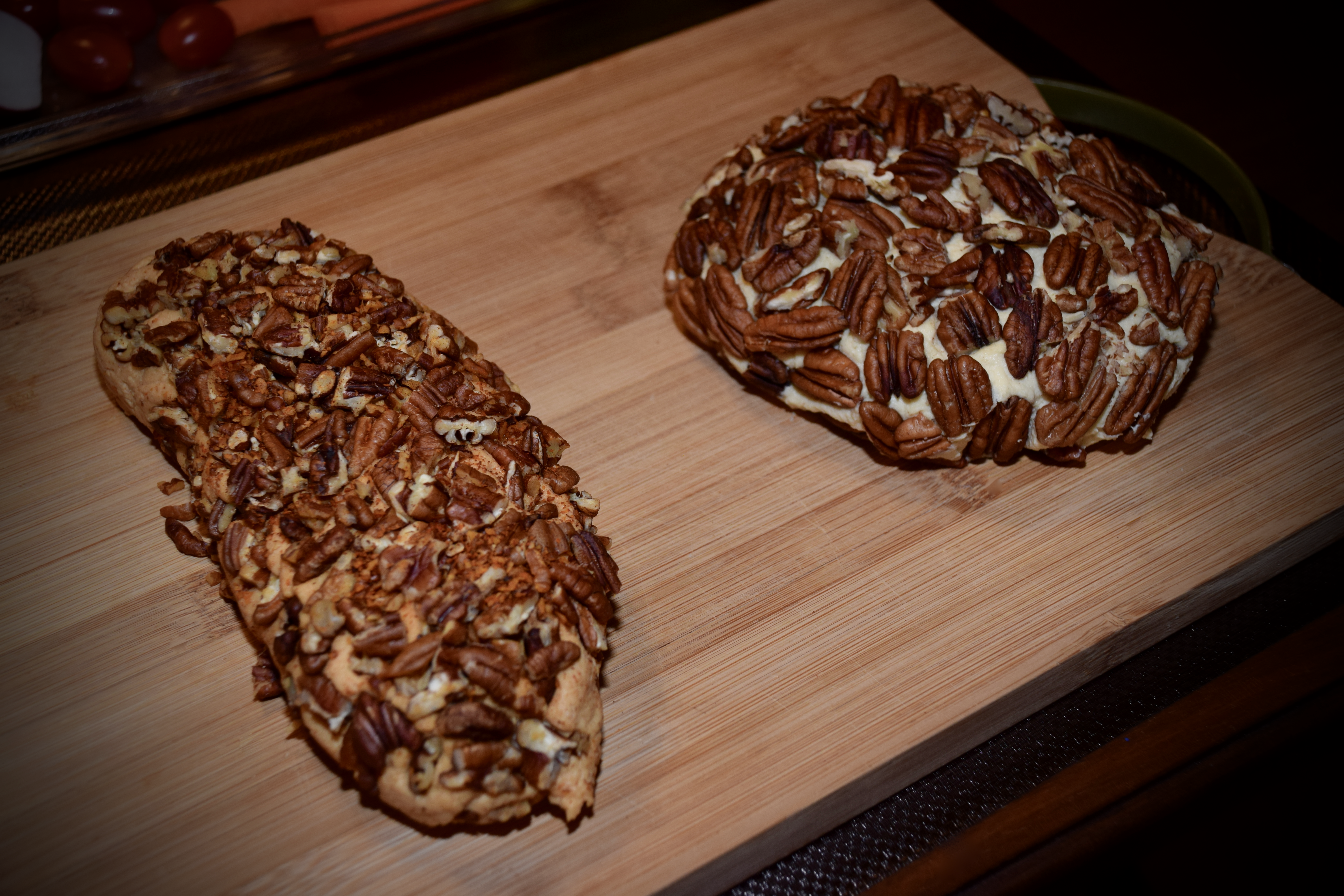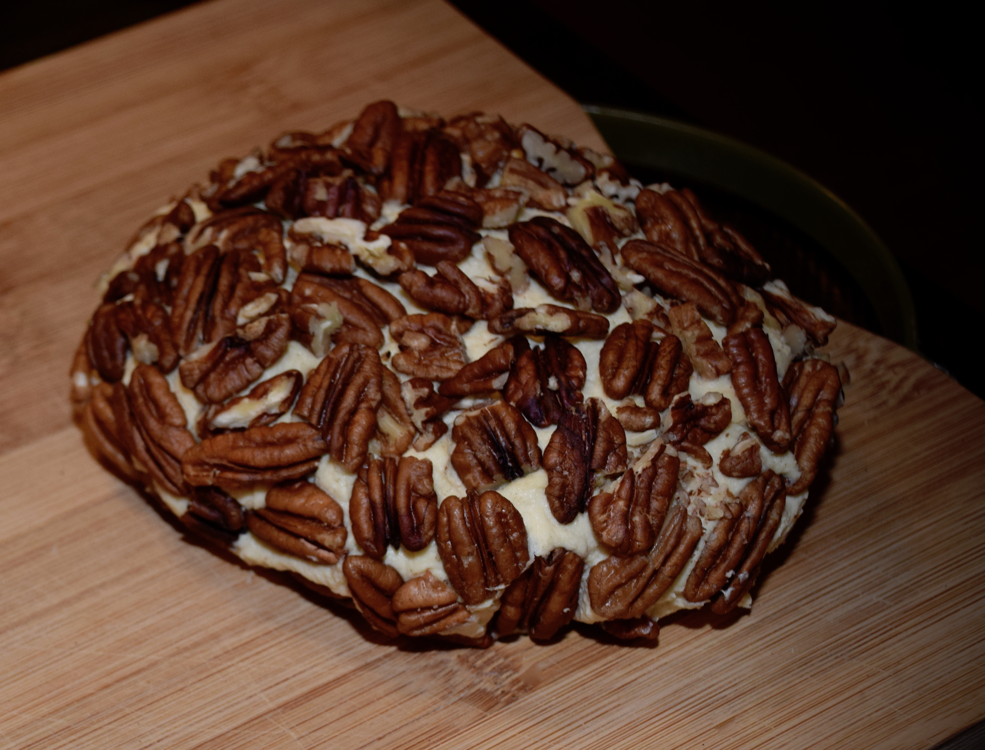 For a cheese ball, you will want to form your cheese into a round using plastic wrap, set in the fridge for an hour, then coat in nuts or seeds (I used pecans), and serve.