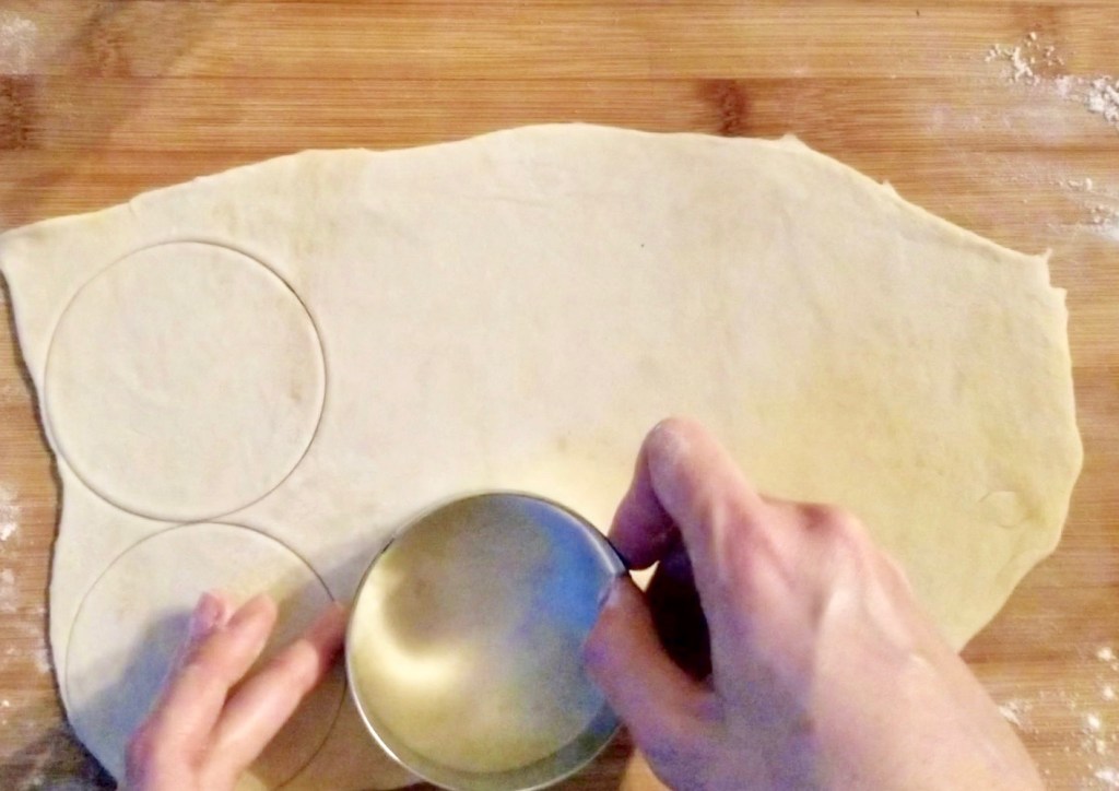 Separate dough into quarters or halves (depending on your counter space) and roll out on a lightly floured surface. The dough should be a few millimetres thick (quite thin, but not enough to tear). Cut into circles, smaller for tortellini, larger for tortelloni. I used a 3″ cookie cutter and found it was a bit large for tortellini.