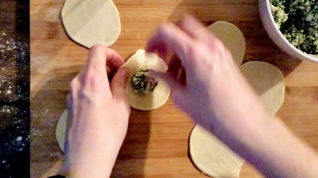 Add about a teaspoon of filling (or more, or less, depending on your circle sizes) in the centre of the round. Fold the dough over the filling in a crescent shape and pinch closed around the edges. If you are having trouble forming the seam, add some water to help the dough adhere to itself. (I didn’t find this necessary, though.) To make the tortellini shape, bring the pointed corners together in the centre and twist under.