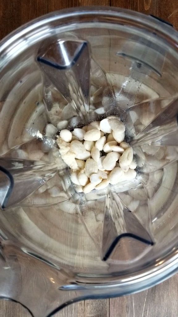 If you want to follow my example, soak 2 cups of raw (organic) almonds in boiling water for 30 minutes until they have softened. Drain and peel! Apply a bit of pressure to the skins and they should slide off (or, pop). Once you have peeled all your almonds, rinse them and pile them in your blender. If you want to avoid the hassle, purchase blanched, peeled almonds and measure out 2 cups.