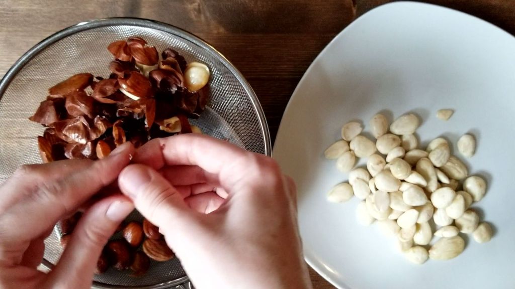Once the almonds have softened, they should be easy to peel. Peel them all, and then rinse and add to your blender. (You can use the peels in different recipes, as suggested by the recipe originator.)