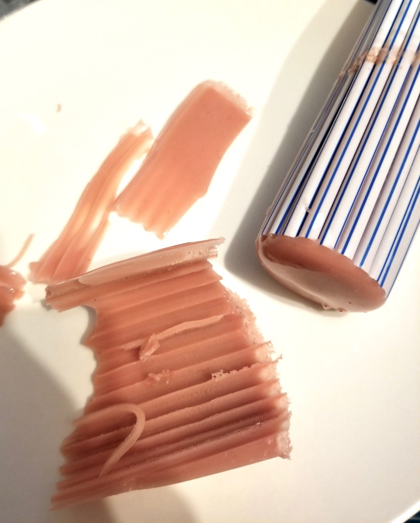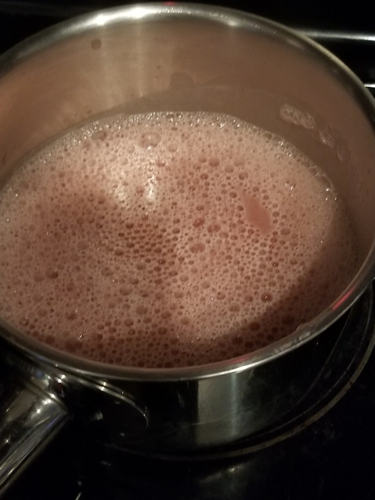 Heat mixture on medium high heat, stirring regularly, until it reaches a low boil. Allow the mixture to cool only just below a boil (too cool, and it will solidify) and pour into straw molds. As I stated earlier, the mixture will overflow from the bottom into the mug, but will cool as it does so and provide a plug for the straws to fill. Once filled, place the mug with straws and mixture into the refrigerator to cool and set. It should only take 30 minutes for the worms to set.