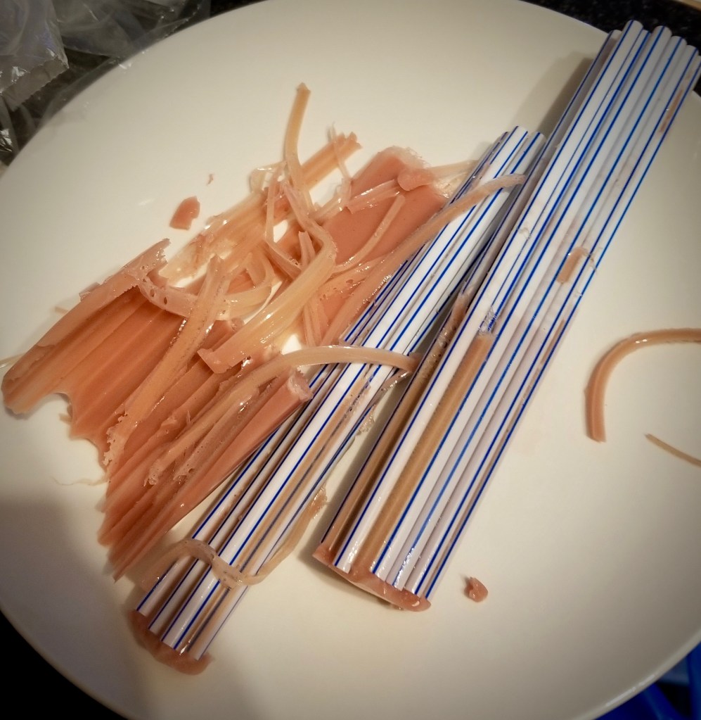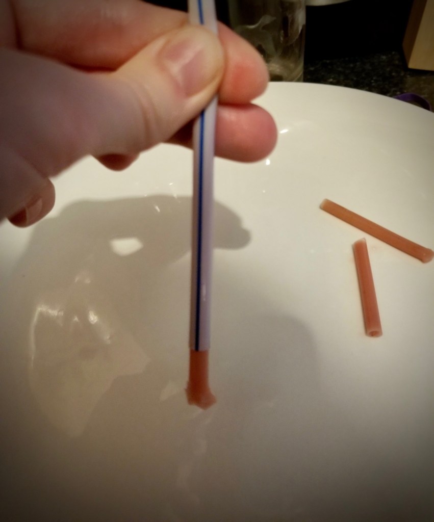 Once the worms have set, peel off the extra mixture, and start to empty the straws. You should only have to squeeze on the upper end of the straw to push out the worm. Keep squeezing, or grab and pull.