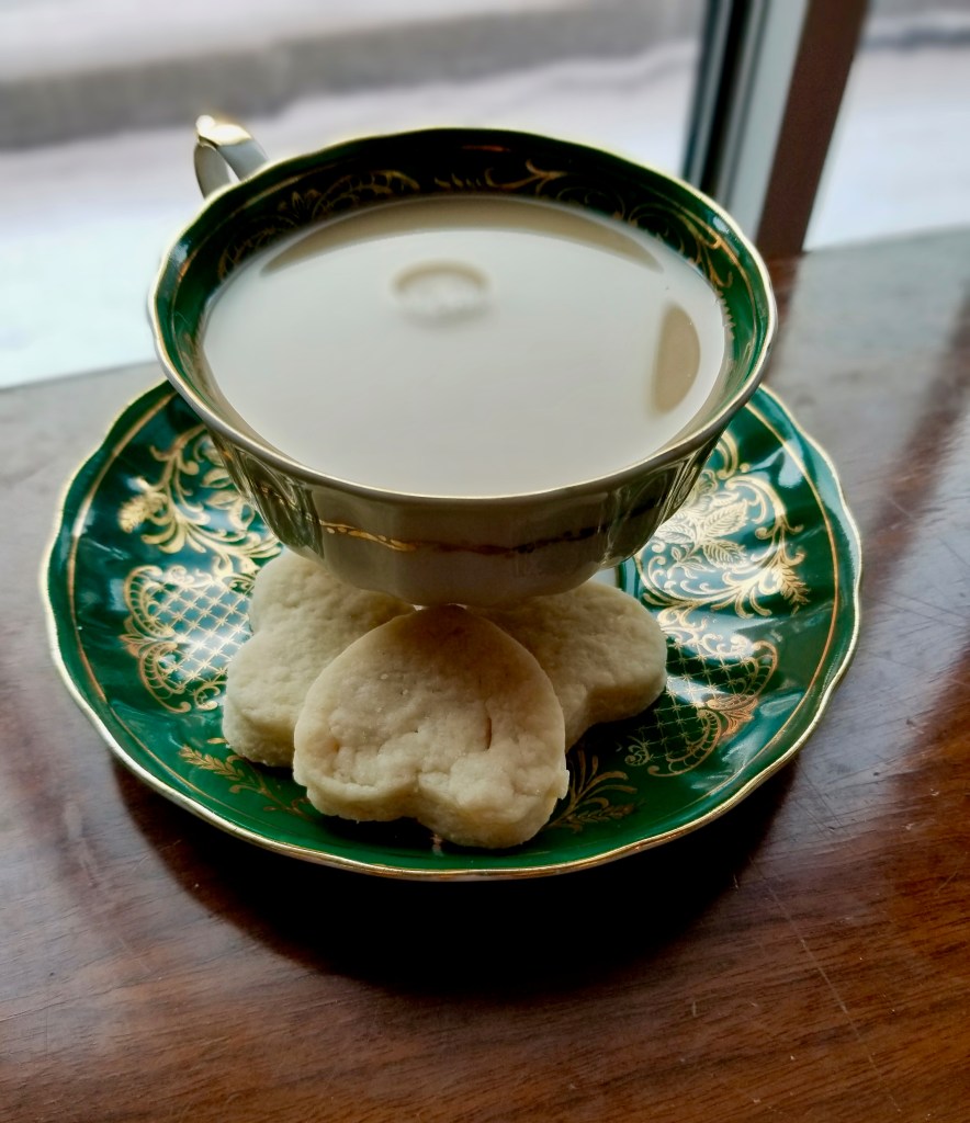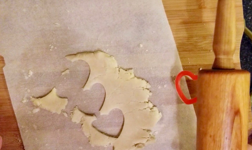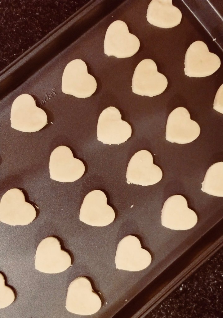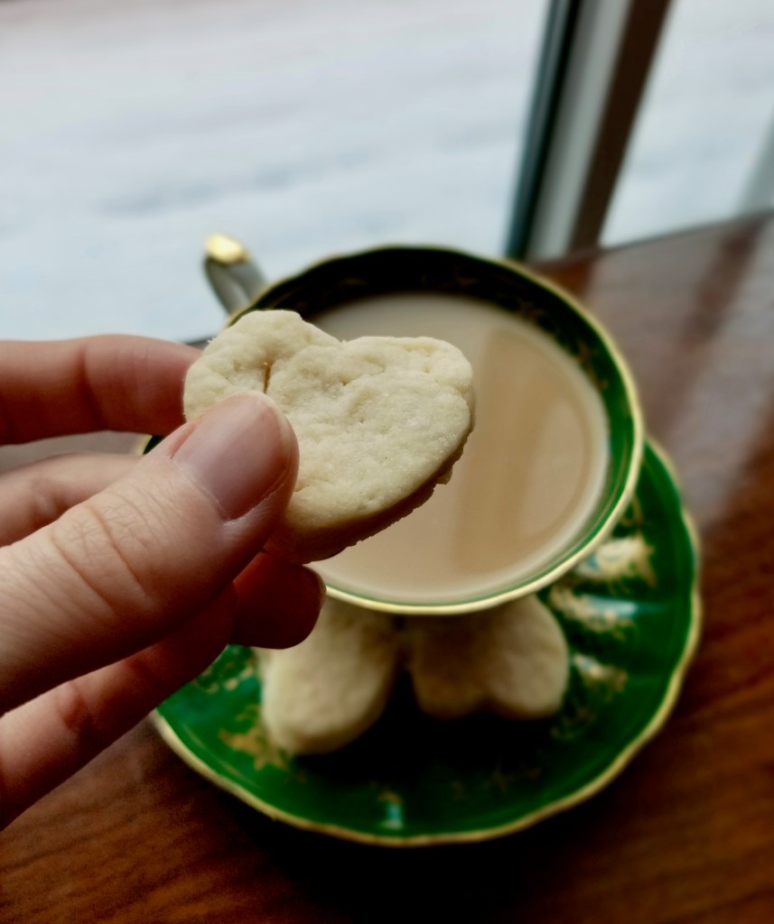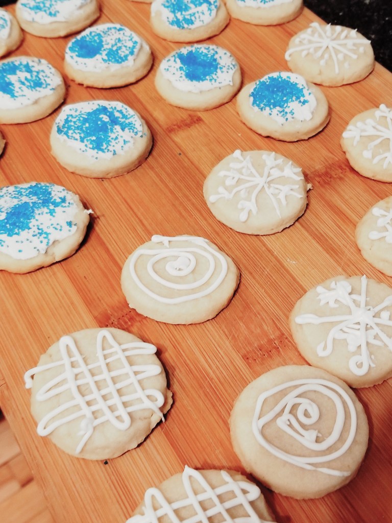 They taste quite like shortbread, but not quite as flakey or buttery, and much like a sugar cookie. The recipe came out of a failed attempt at butter cookies. The recipe, found online, was supposed to yield piped dough, but it wasn’t nearly soft enough for that. Even adding more liquid, wouldn’t soften it enough to be able to pipe it. So, I made the best of the failure, and rolled the dough out, cut it, baked it, and LOVED the result.